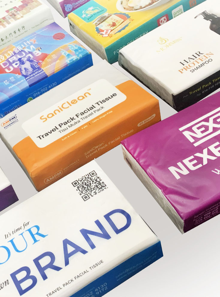 With its useful & quality product advantages, public will never say no to receive it. The higher paper count, the longer advertisement life. The new travel pack facial tissue will add value to your ads with more possibilities!